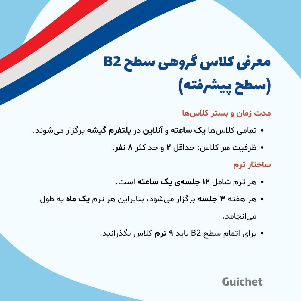 اگر به سطح متوسط زبان فرانسه رسیدهاید و میخواهید مهارتهای خود را به سطحی برسانید که بتوانید روان، دقیق و طبیعی صحبت کنید، ثبتنام در کلاس فرانسه آنلاین خصوصی سطح B2 در آموزشگاه زبان فرانسه گیشه بهترین انتخاب برای شماست.