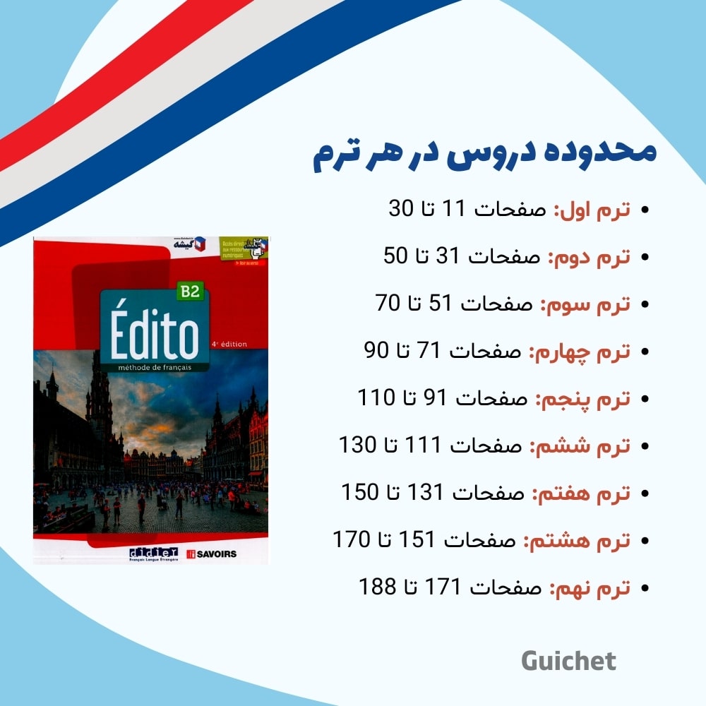 در کلاسهای خصوصی سطح B2 از کتاب Édito 2022–2024 جلد سوم استفاده میشود که شامل ۱۲ فصل آموزشی با تمرکز بر گسترش واژگان، دقت گرامری و روانی در گفتار است.